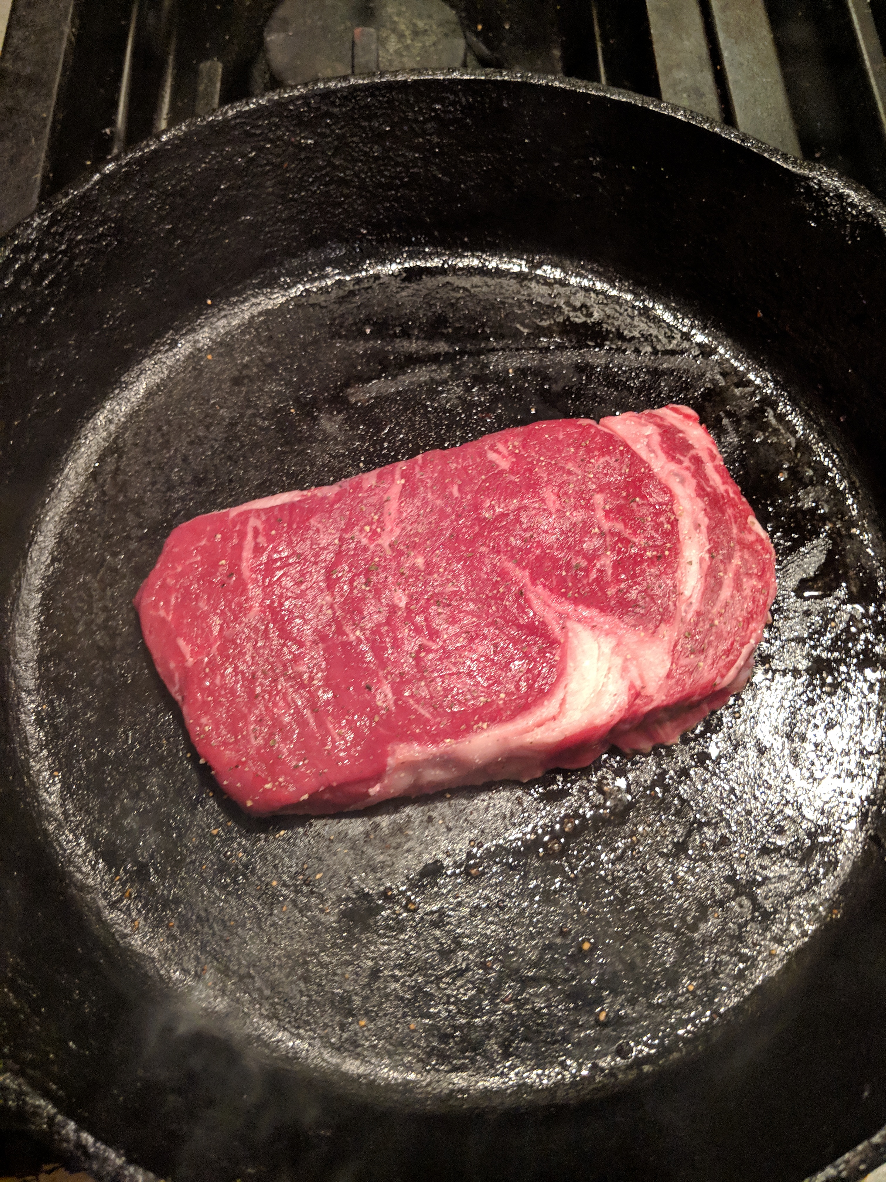 Unwrap your steak and throw some kosher salt on it. Leave it sit on the counter while your pan heats up.