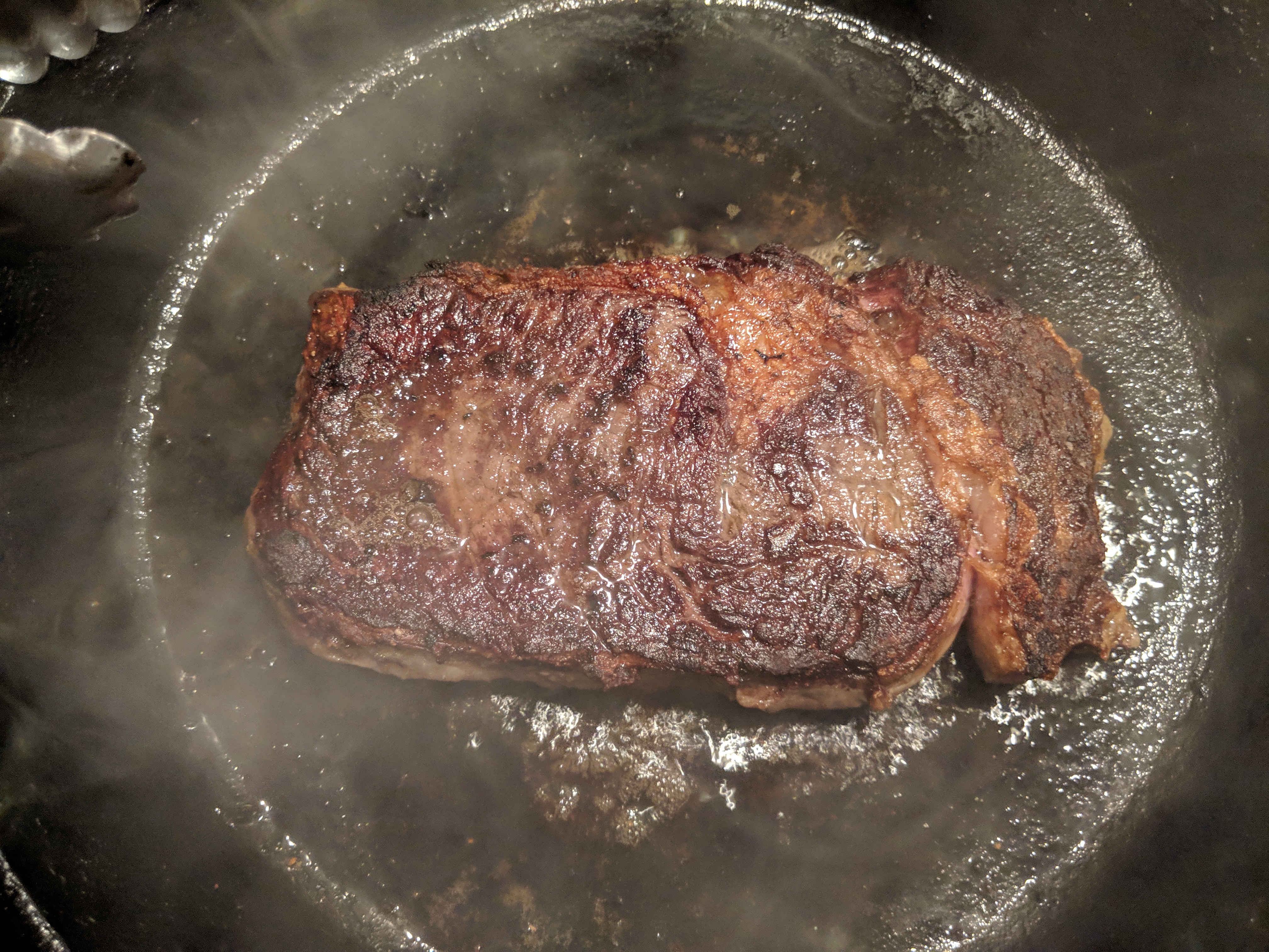 You can do all of this on a grill also, by the way. But it’s March in Wisconsin and there’s about a foot of snow on the ground surrounding my grill, so I did the photos for this on my stovetop. If you’re going to do this on a grill, bank the coals to one side and sear the steak directly over them to form the crust on both sides. It will go faster than the stove (assuming your coals are hot and close to the grate) but there’s no way to collect the juices for basting. Once you’ve seared both sides move the meat to the cold side of the grill and close the lid for a few minutes to finish the cooking. Let it rest for five to ten minutes when it’s done.