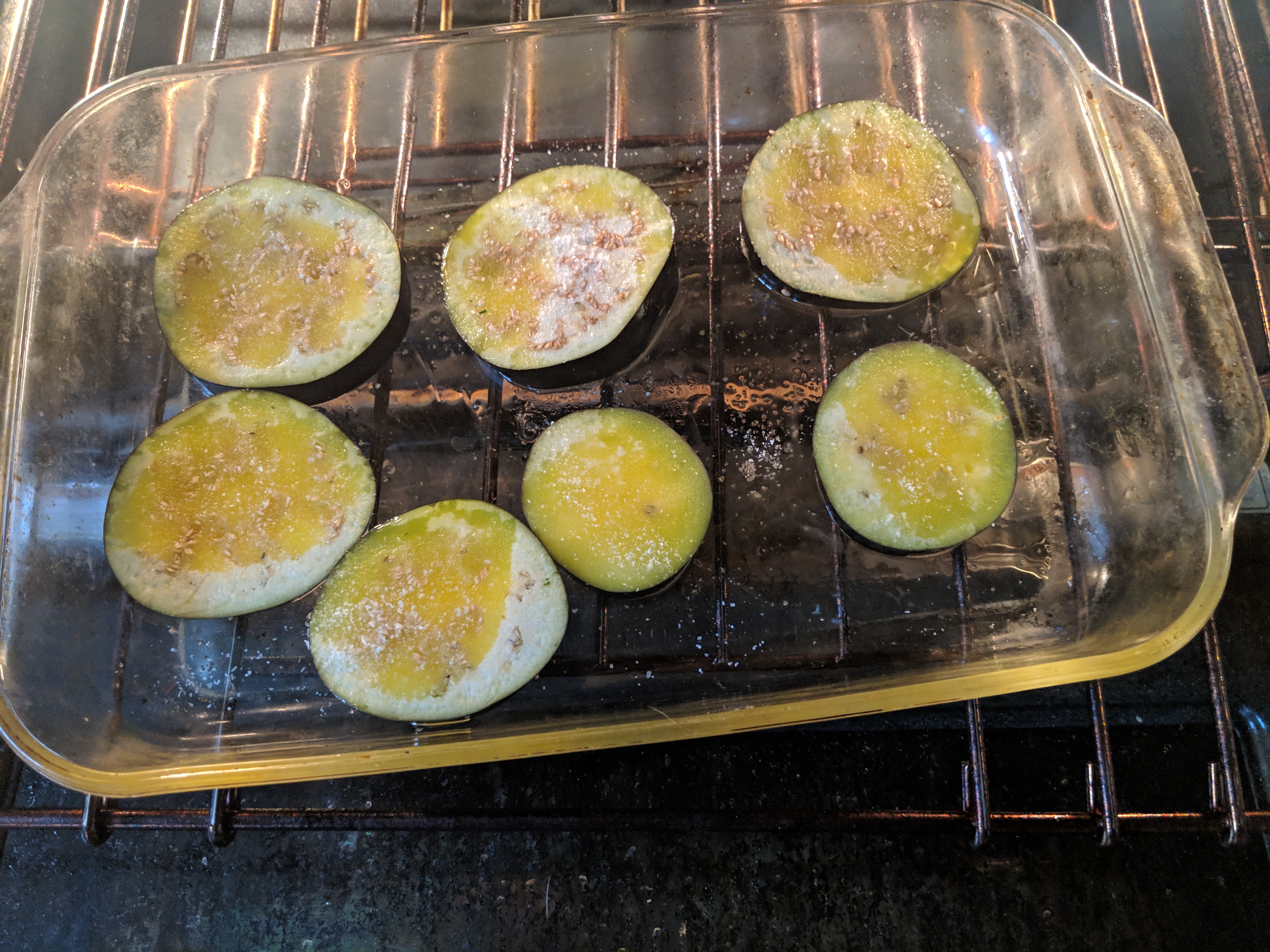 Slice your eggplant into 1/2 inch or so coins – they need to be a bit thick. You want them mushy, not crispy.