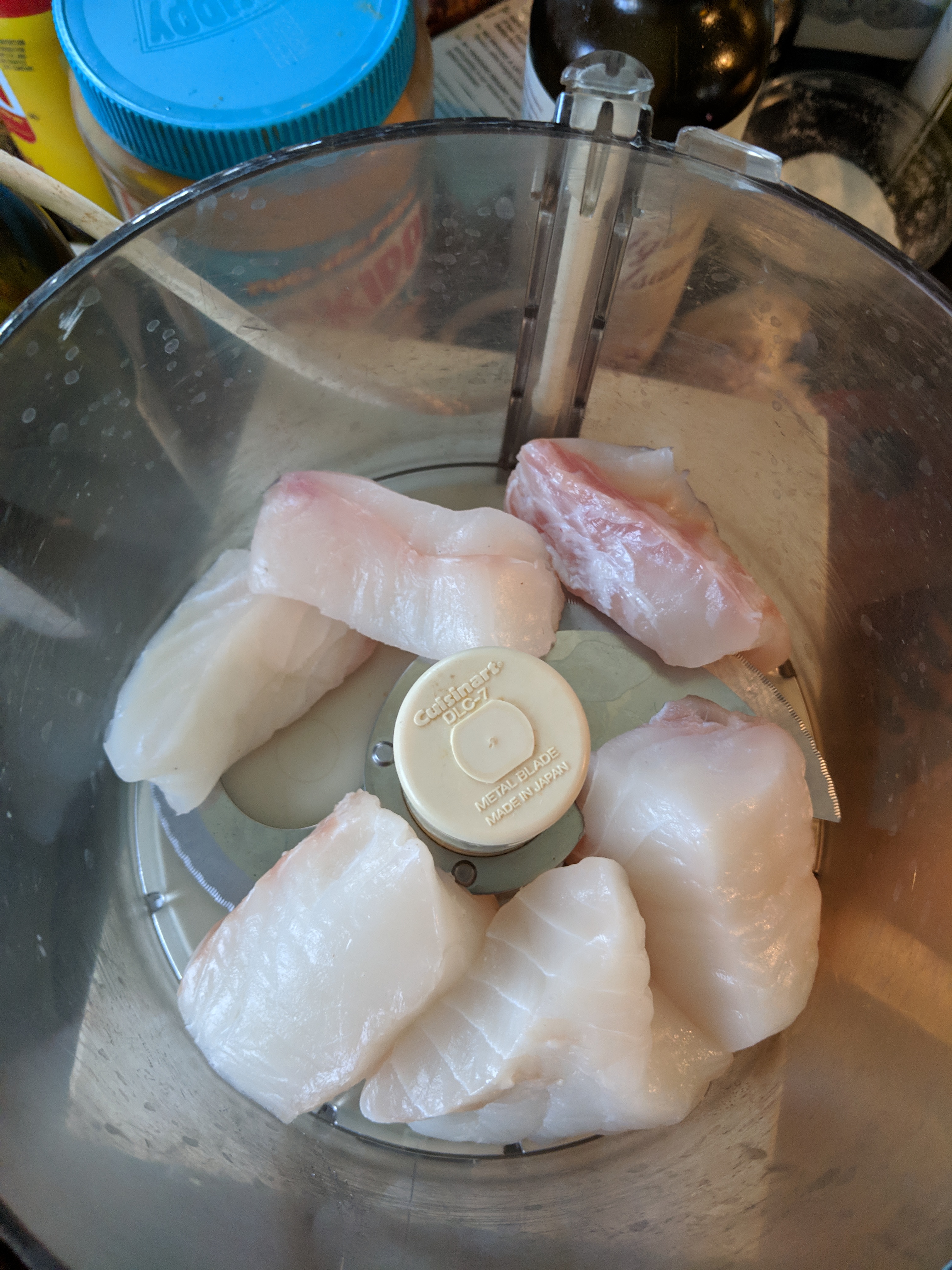 Cut the fish into chunks and pulse them in a food processor for about 20 seconds.