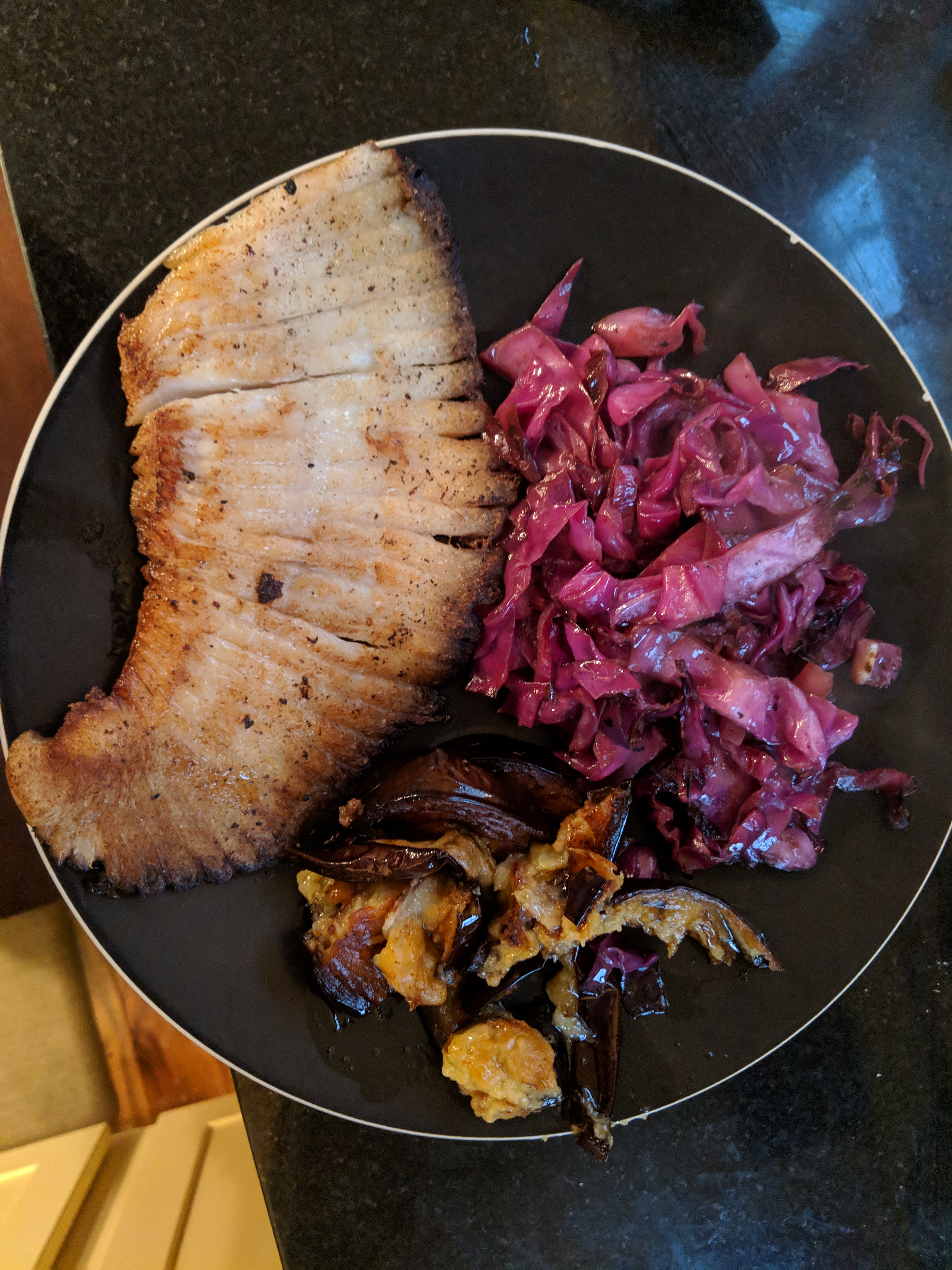The plate above shows pan seared skate wing with fresh lemon, plated with sauteed red cabbage and mashed eggplant (you can see my eggplant recipe in my post on sabich (