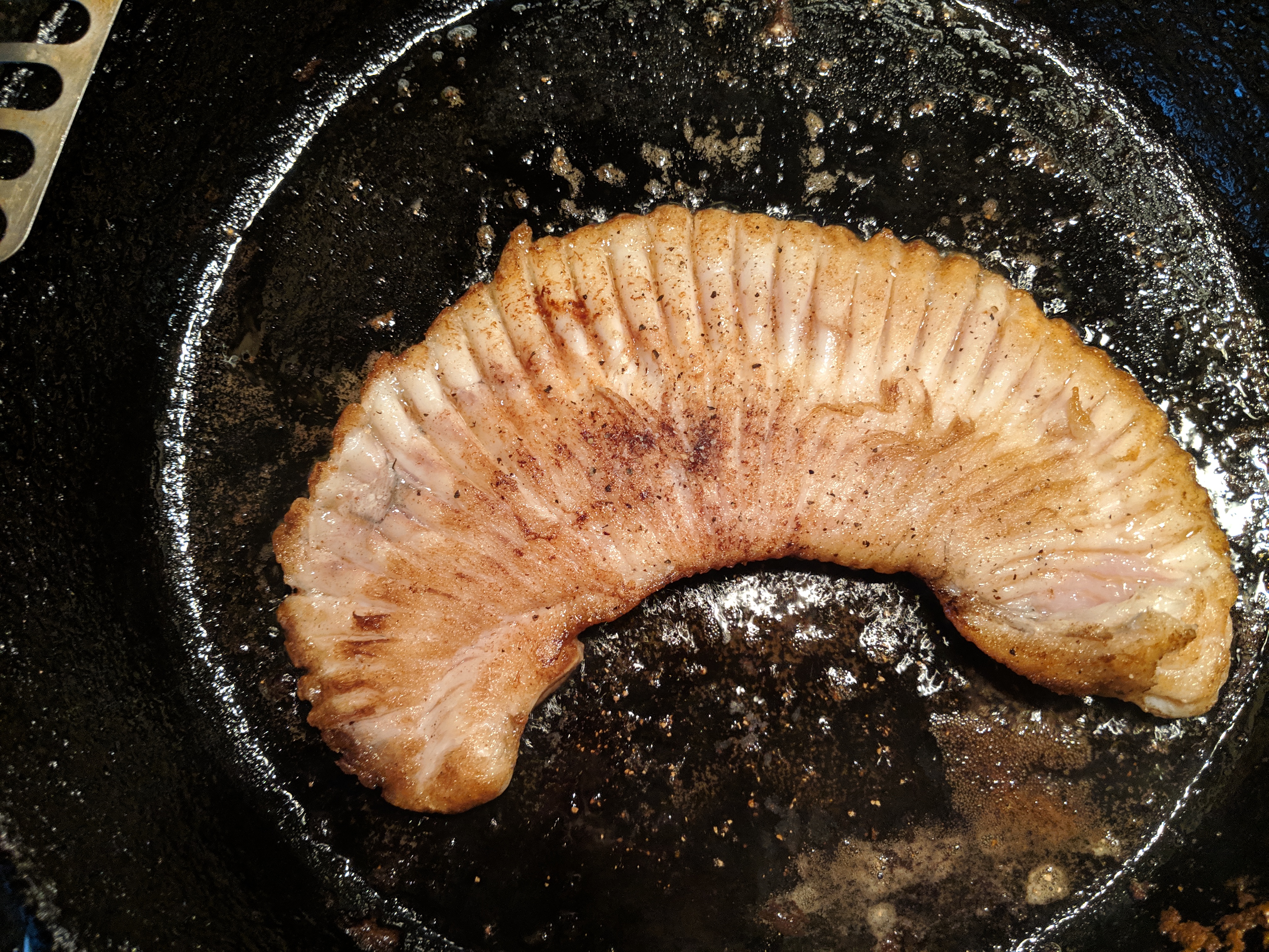 Season with salt and pepper and continue to cook it on the other side for a few more minutes until the edges start to curl.