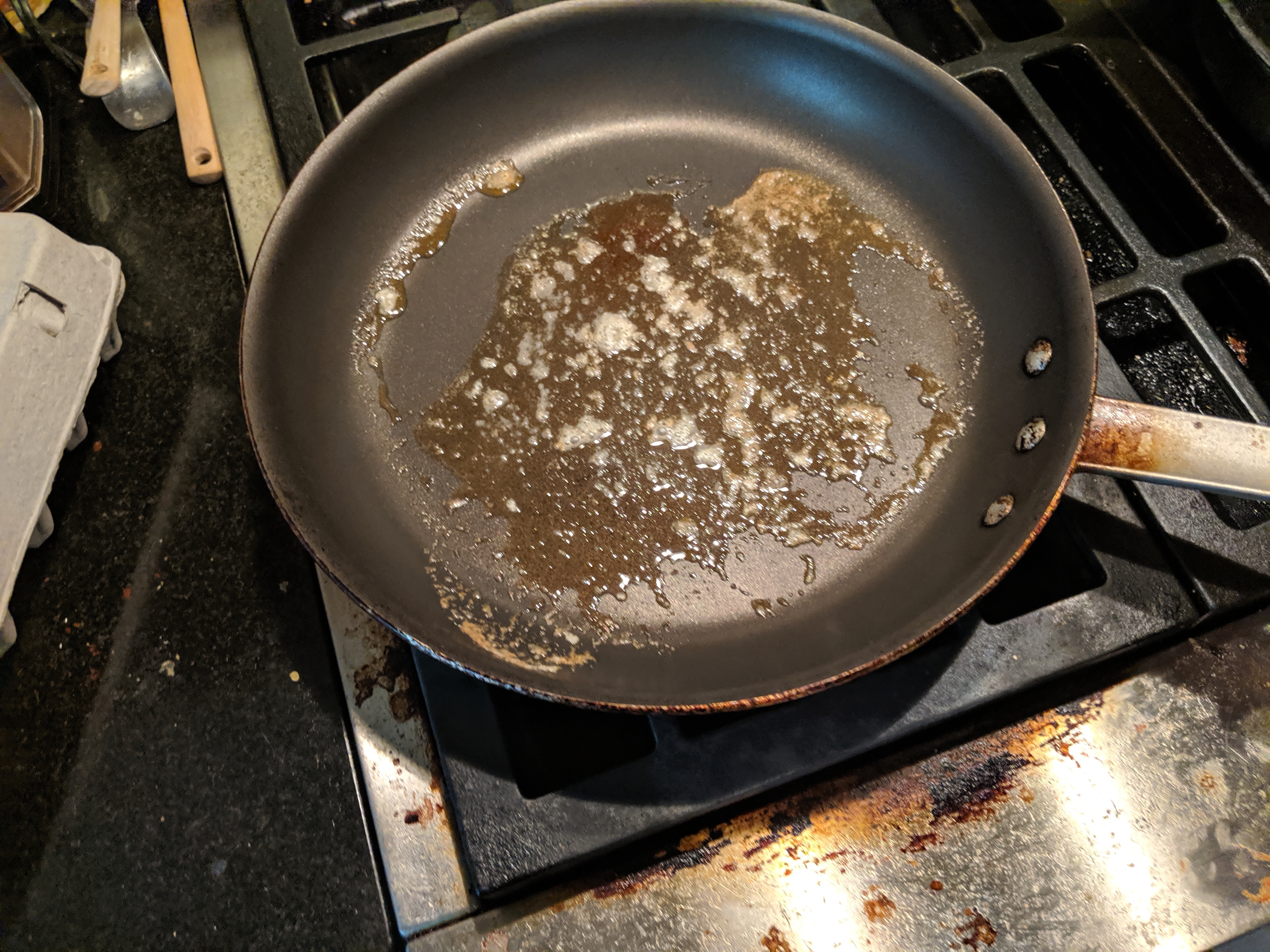 Put your pan over low heat and drop a knob of butter into it. Watch it melt.