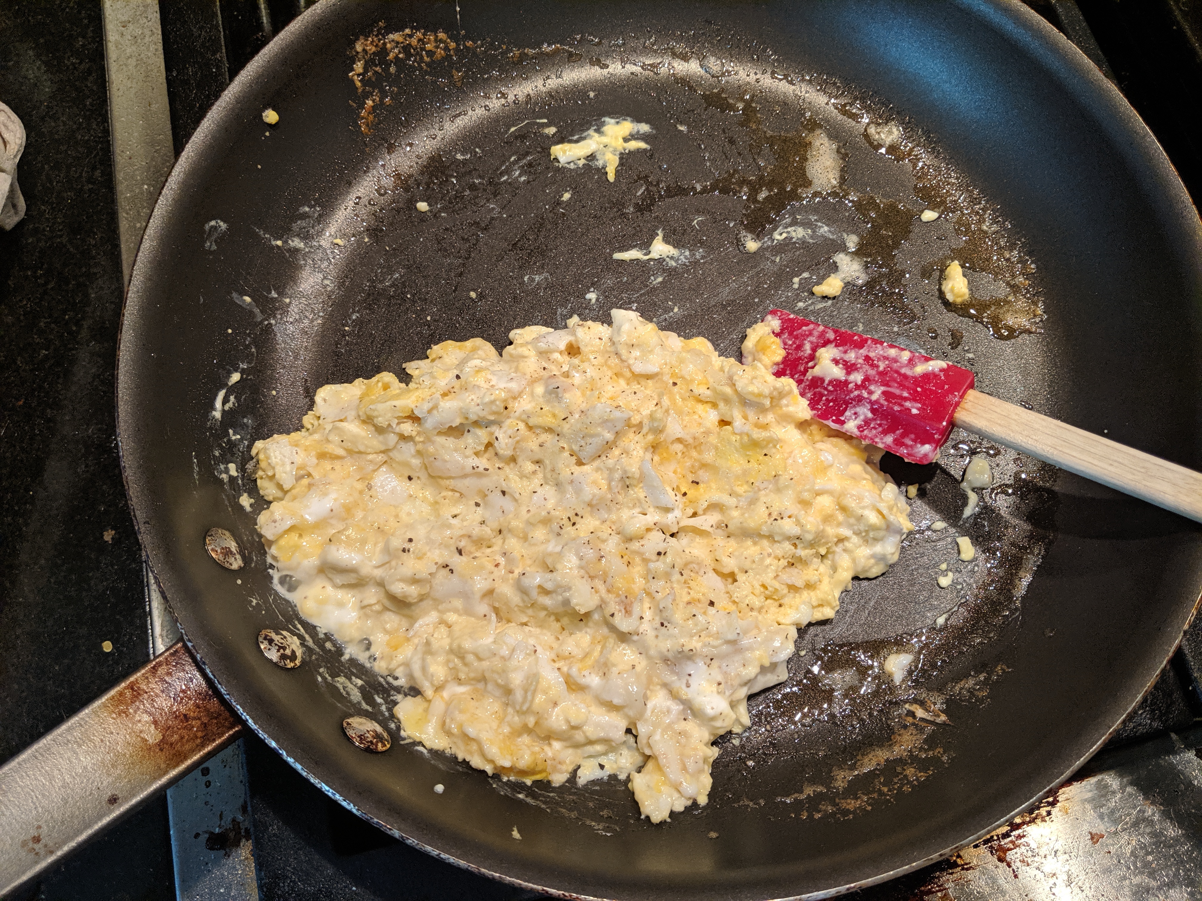 When the liquid in the eggs has thickened, turn the heat down a bit, and add your dairy, salt, and pepper. Stir in your dairy until it’s fully incorporated.