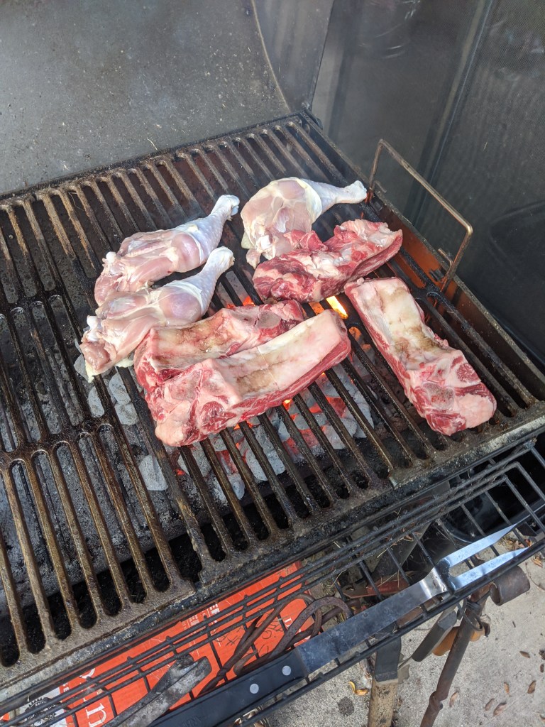 Once the grates are nice and hot, oil them (I’m using an avocado oil spray for this nowadays), and put the ribs meat side down over the coals.