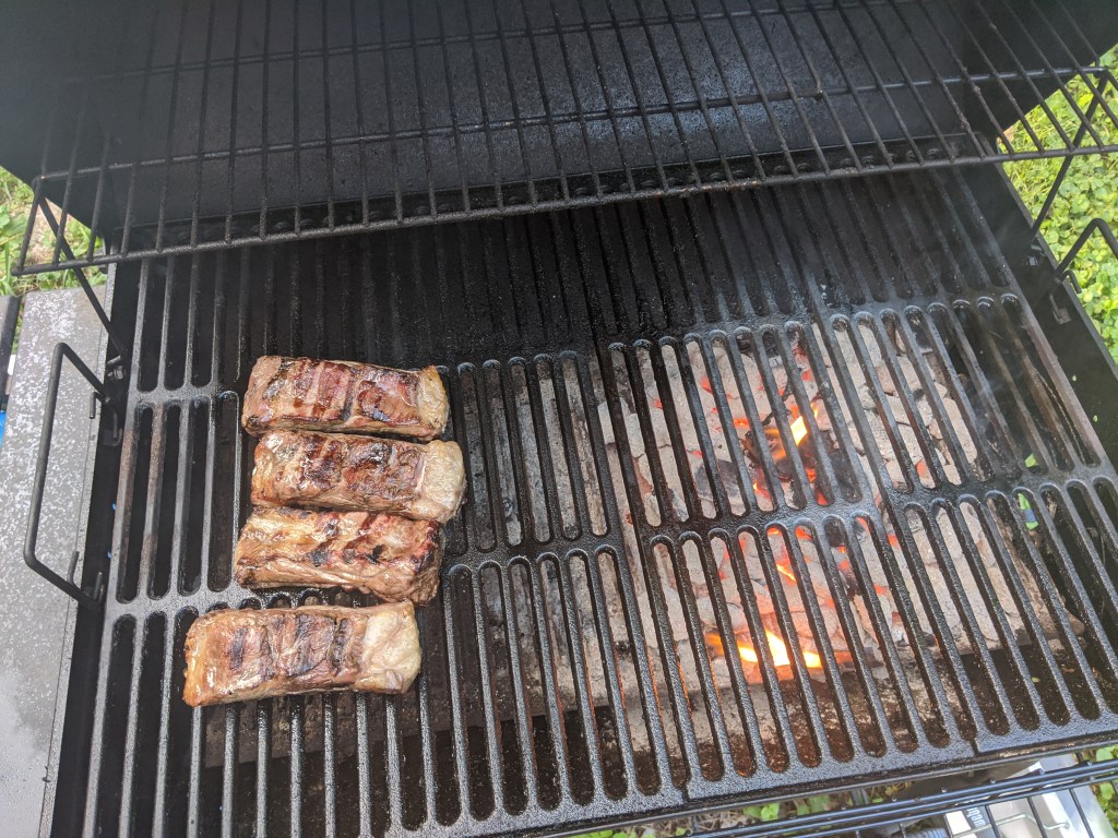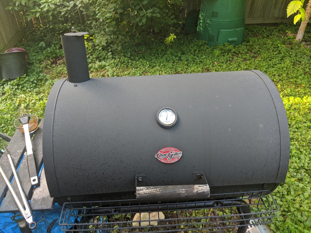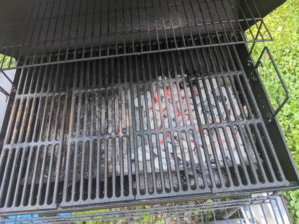 Get your coals lit, and bank them to one side of the grill when they’ve burned down. In the Char Griller I bank the coals by the lower vent.