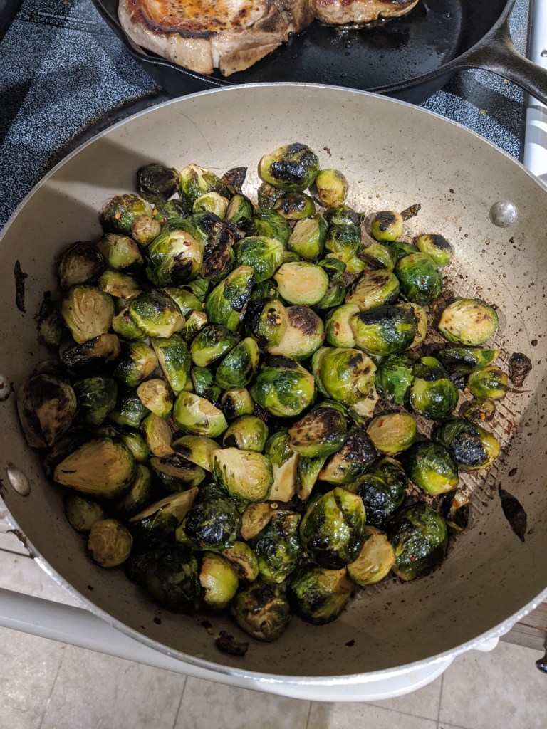 This recipe is pretty easy – you are going to cook the Brussels sprouts three ways in succession (seared, then steamed, then roasted), but none of them are difficult. You will need to pay attention during the first two steps of the process, but only closely in the second step. Like most of my recipes, the spicing is to taste, so I can’t really give you specific amounts. You’ll need to play with it a few times.